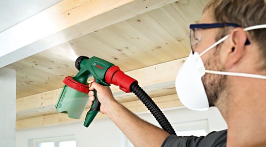 Для обработки больших площадей используют краскопульт — использование специального оборудования облегчает и многократно ускоряет работу. Краскопульт не оставляет полос на поверхности, красящий состав ложится тонким ровным слоем.